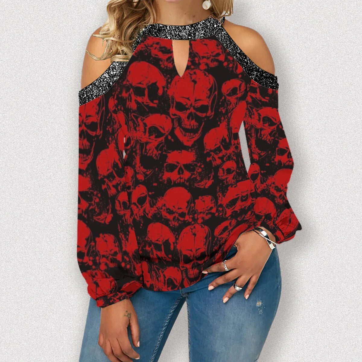 Halloween Skull Print Off The Shoulder Long Sleeve T-Shirt
